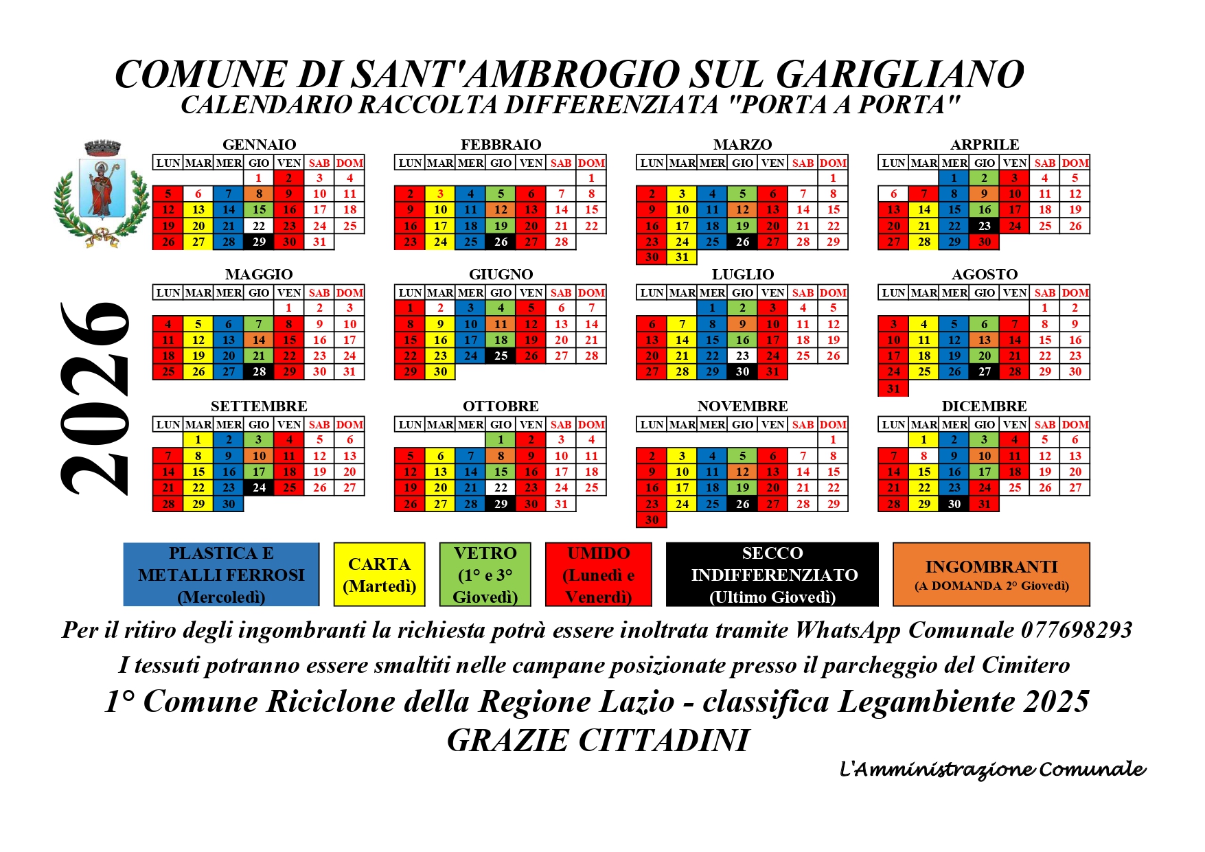 Calendario della racconta dei rifiuti solidi urbani relativo all'anno 2026